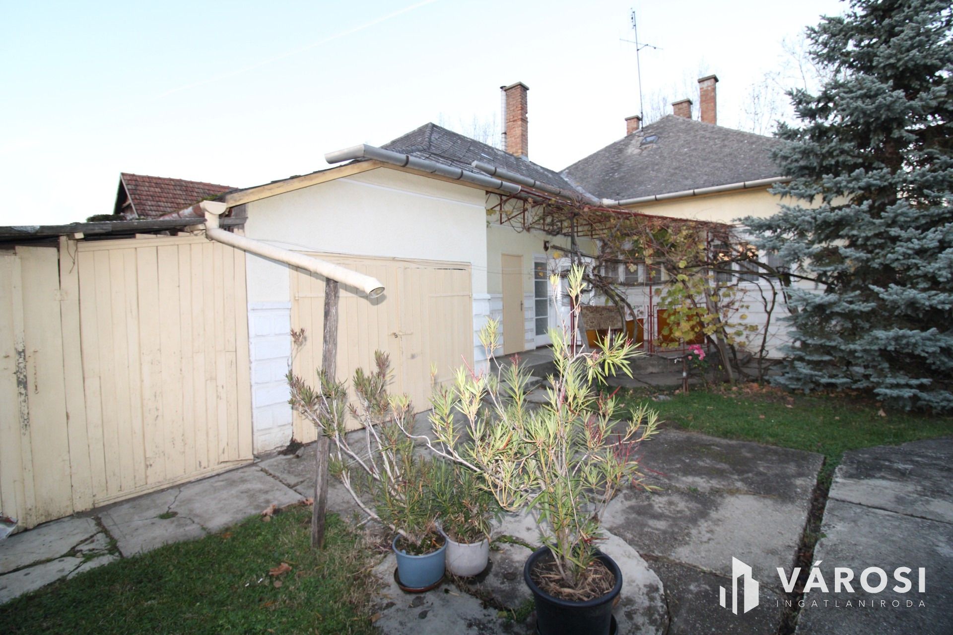 Az ingatlanhoz tartozik egy kisebb terasz, egy garázs, műhely és további tároló helyiségek is.