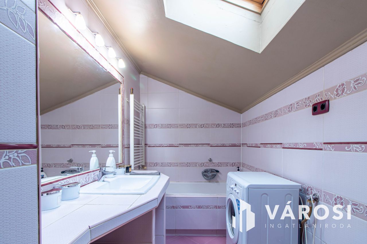 A 2007-ben teljeskörűen átépített és átalakított családi ház 179 m²-es, amelyhez egy 28 m²-es garázs is tartozik. Az alsó szinten egy tágas előtér, egy világos, egybenyitott nappali-konyha-étkező, egy hálószoba és egy fürdőszoba található. Az ingatlan ezen a szinten padlófűtéssel rendelkezik, valamint két hűtő-fűtő klíma biztosítja a megfelelő hőmérsékletet. Az emeleten négy hálószoba kapott helyet, melyek közül az egyik közel 40 m²-es, így akár ketté is osztható. Két szoba teraszkapcsolatos, a folyosón beépített szekrény, valamint egy további fürdőszoba található. Az emeleti helyiségek radiátoros fűtéssel és három hűtő-fűtő klímával vannak ellátva. A ház minden részlete a minőséget és a modern kényelmet tükrözi, a vízhálózat vízlágyítóval van felszerelve, az udvarban pedig egy fűtött, vízforgatós medence biztosítja a kikapcsolódás lehetőségét.