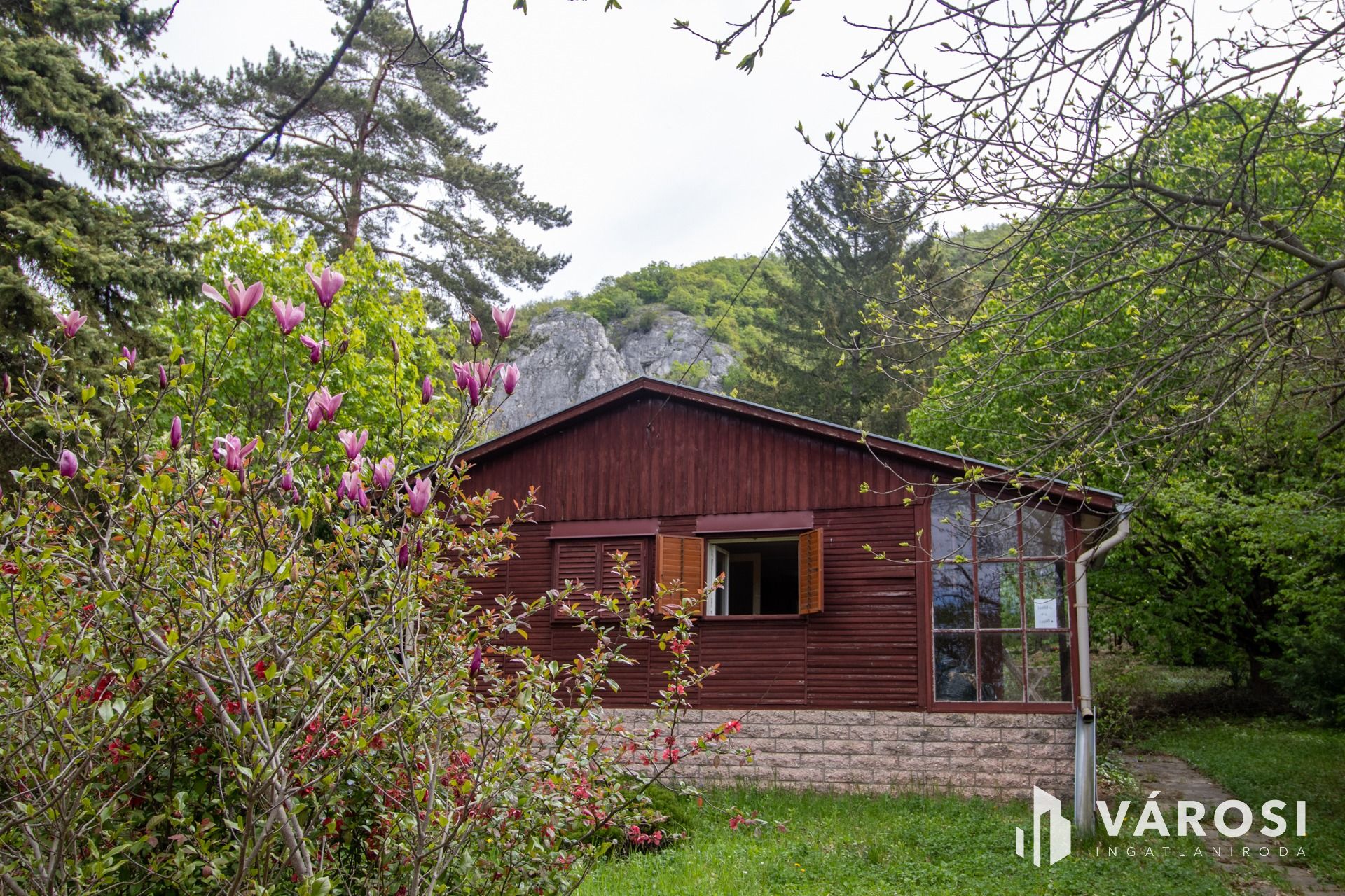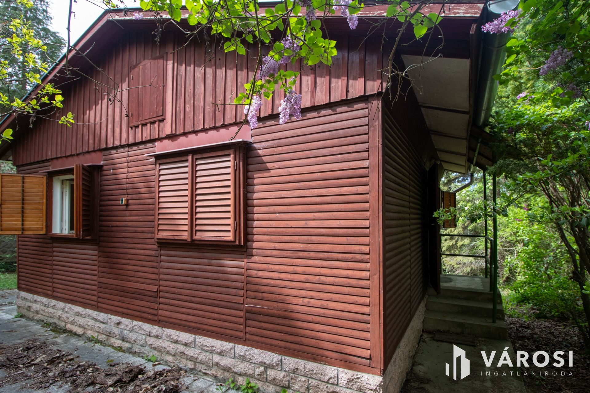 The garden, dotted with flowers, hazelnut, walnut, and pine trees, features a late-70s "ÉVA" type wooden cabin. It is built on a stone-clad concrete foundation and is in remarkably good (well-maintained) condition, featuring a living room, bedroom, kitchen, bathroom, and terrace. Additionally, in the corner of the plot, there is a brick-built summer kitchen, also in good condition, with useful storage spaces and an attic.