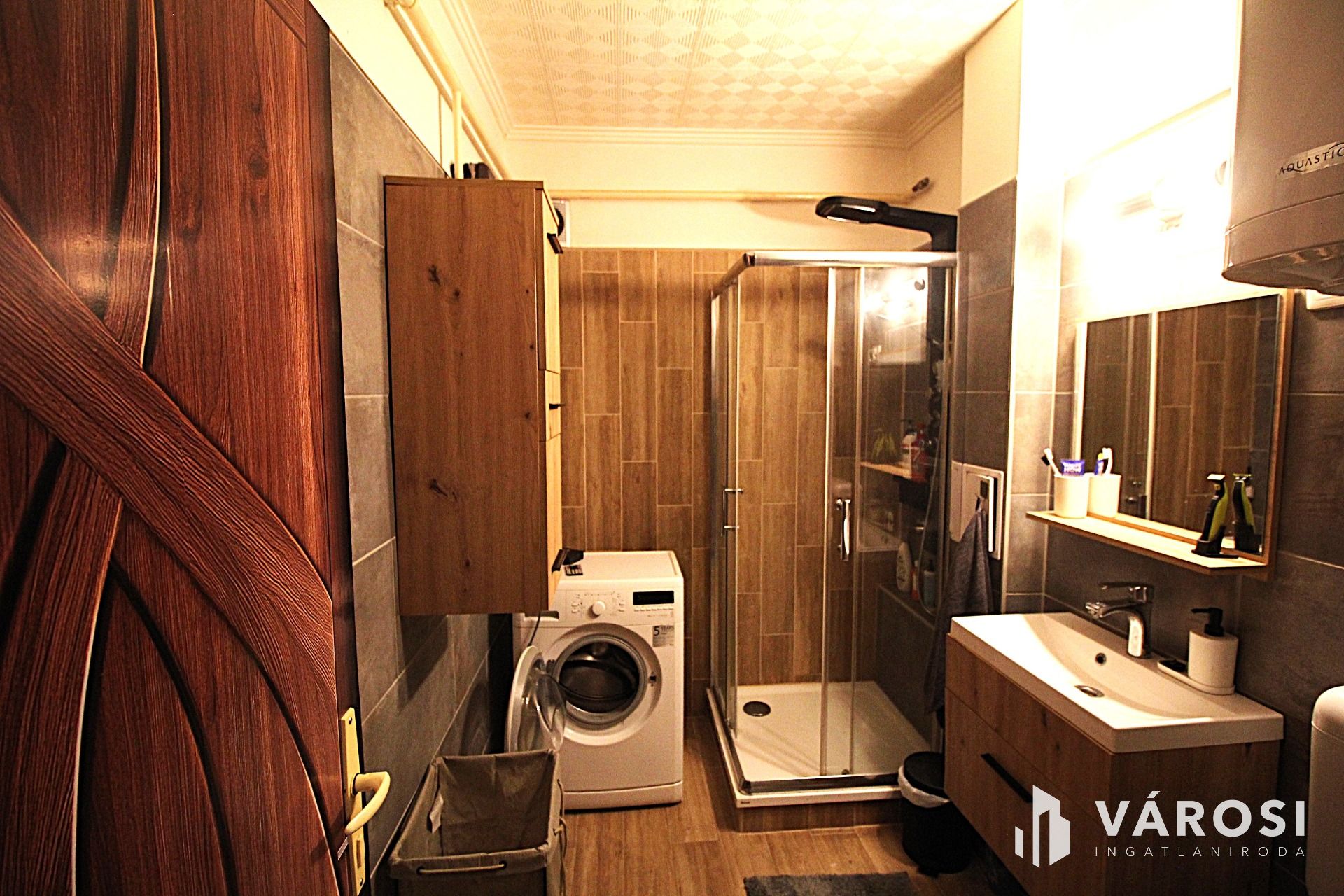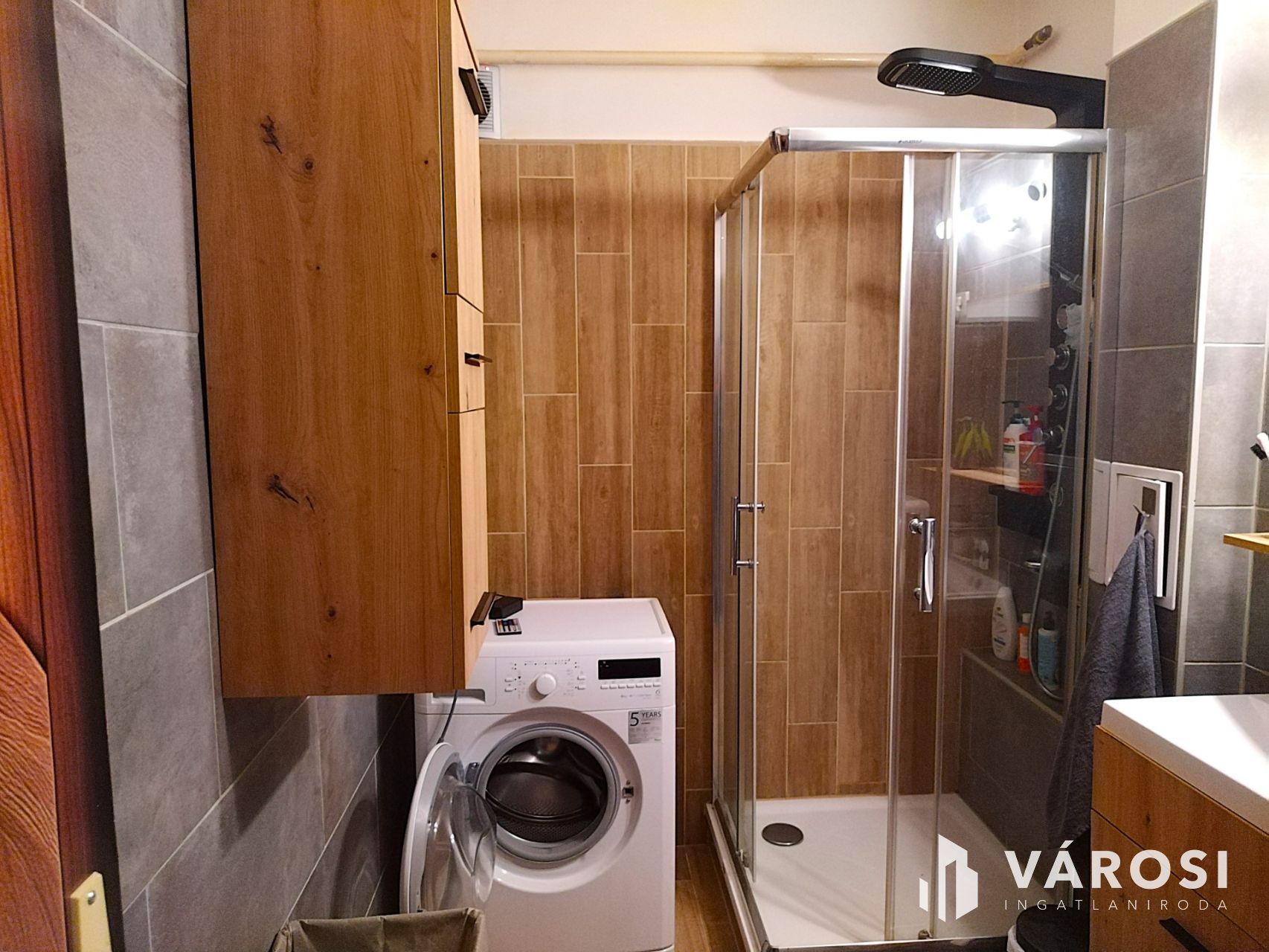 A fürdőszoba elegáns falburkolatokkal, járólapokkal, stílusosan lett kialakítva.
