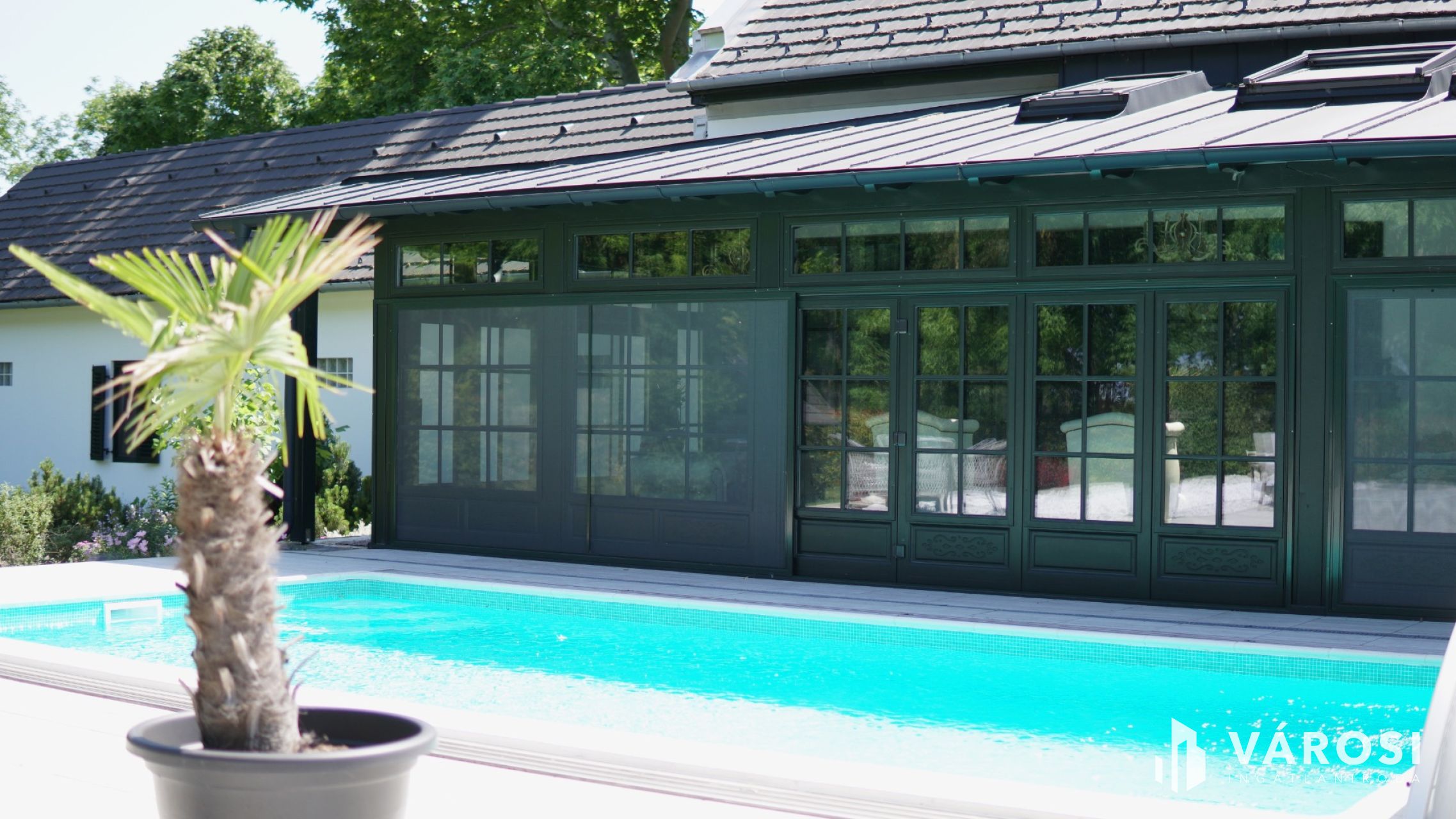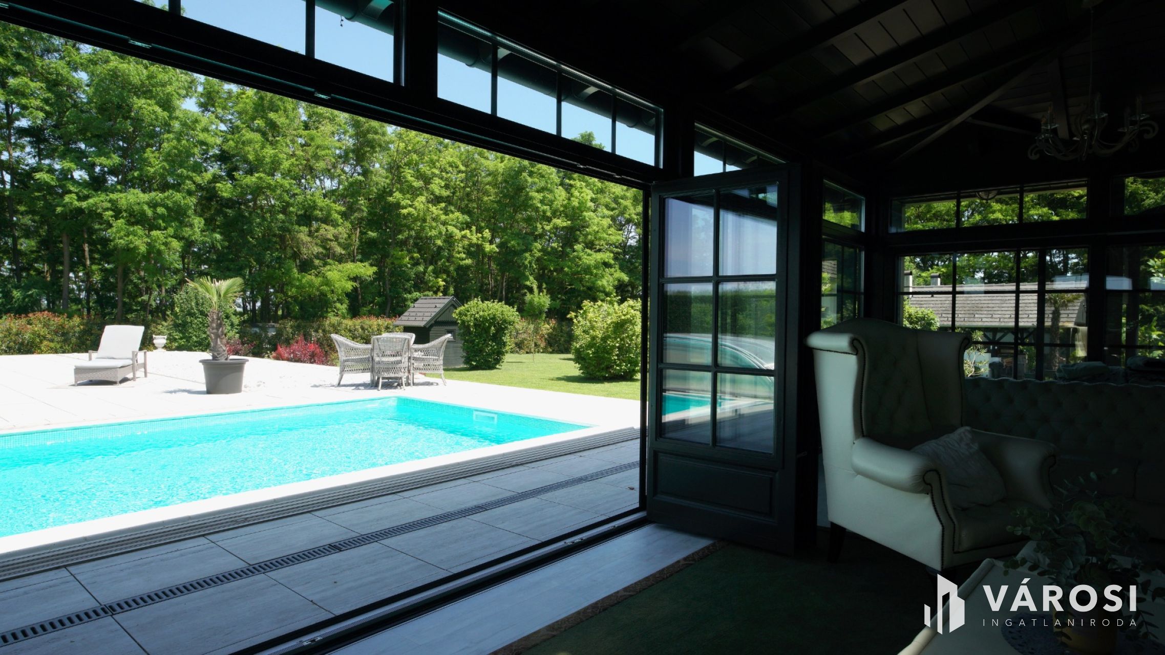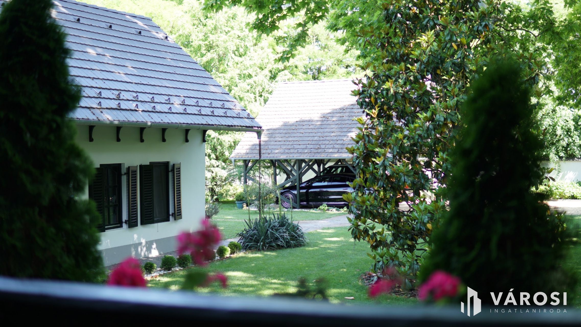 Az ingatlanhoz tartozik egy impozáns nagyméretű fedett kerti sütögető hely és egy háromállásos, elektromos autók töltésére is alkalmas nyitott garázs. A kert szívében található a medence, amely körül exkluzív márvány napozóterasz biztosítja a luxusérzetet.