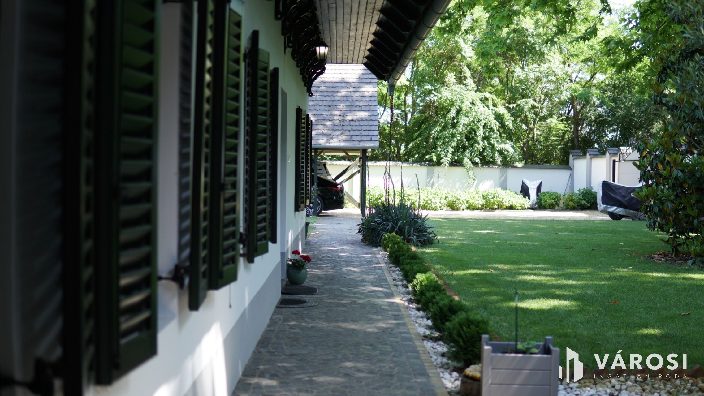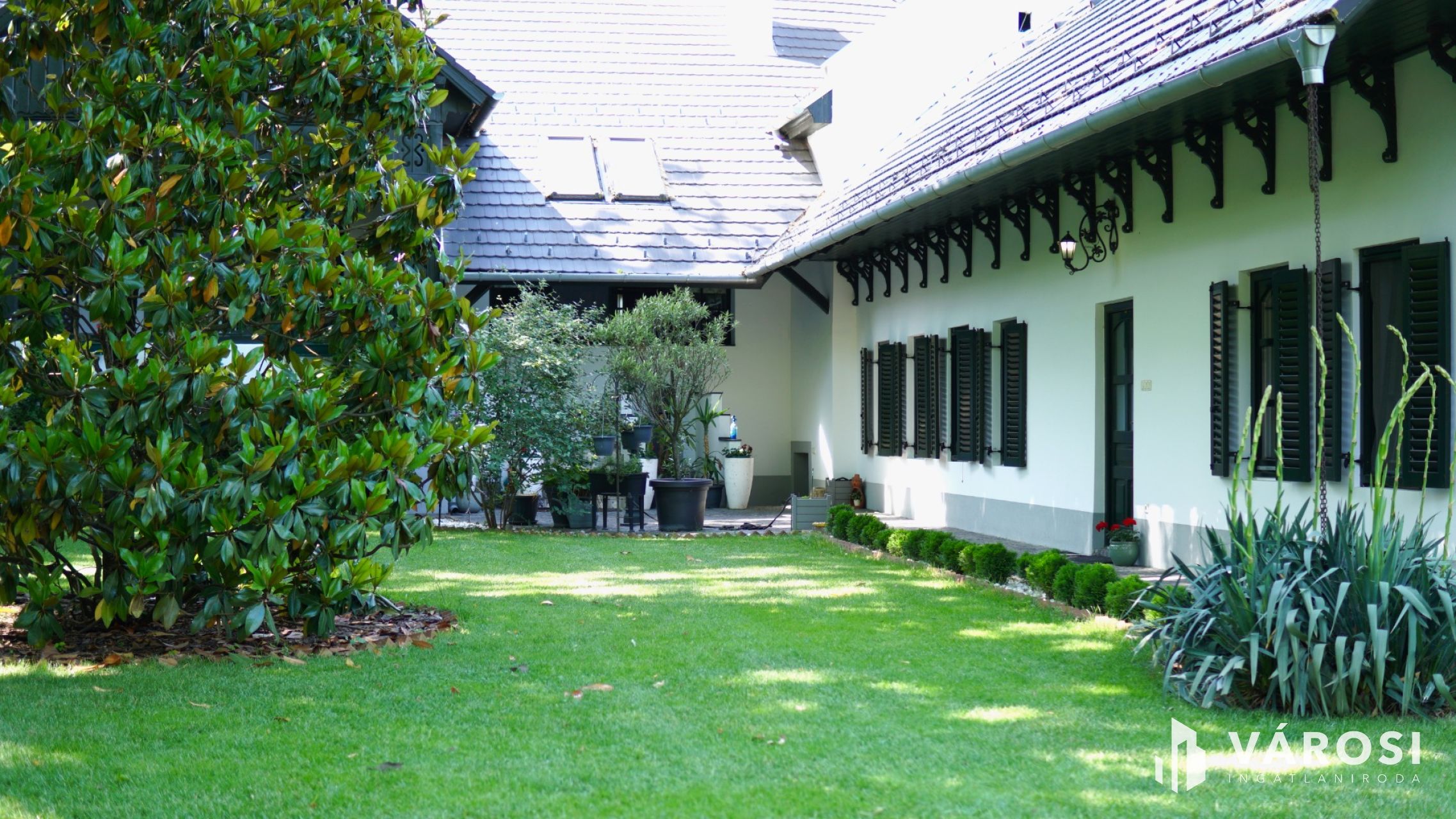 Az épületet körülölelő udvar teljesen parkosított és modernizált. A hangulatot a gyönyörű, évente rendszeresen gondozott platán fák és a terület határán magasló Leylandi ciprus határozza meg, amely jól mutatja a jelenlegi tulajdonos körültekintő gondosságát.