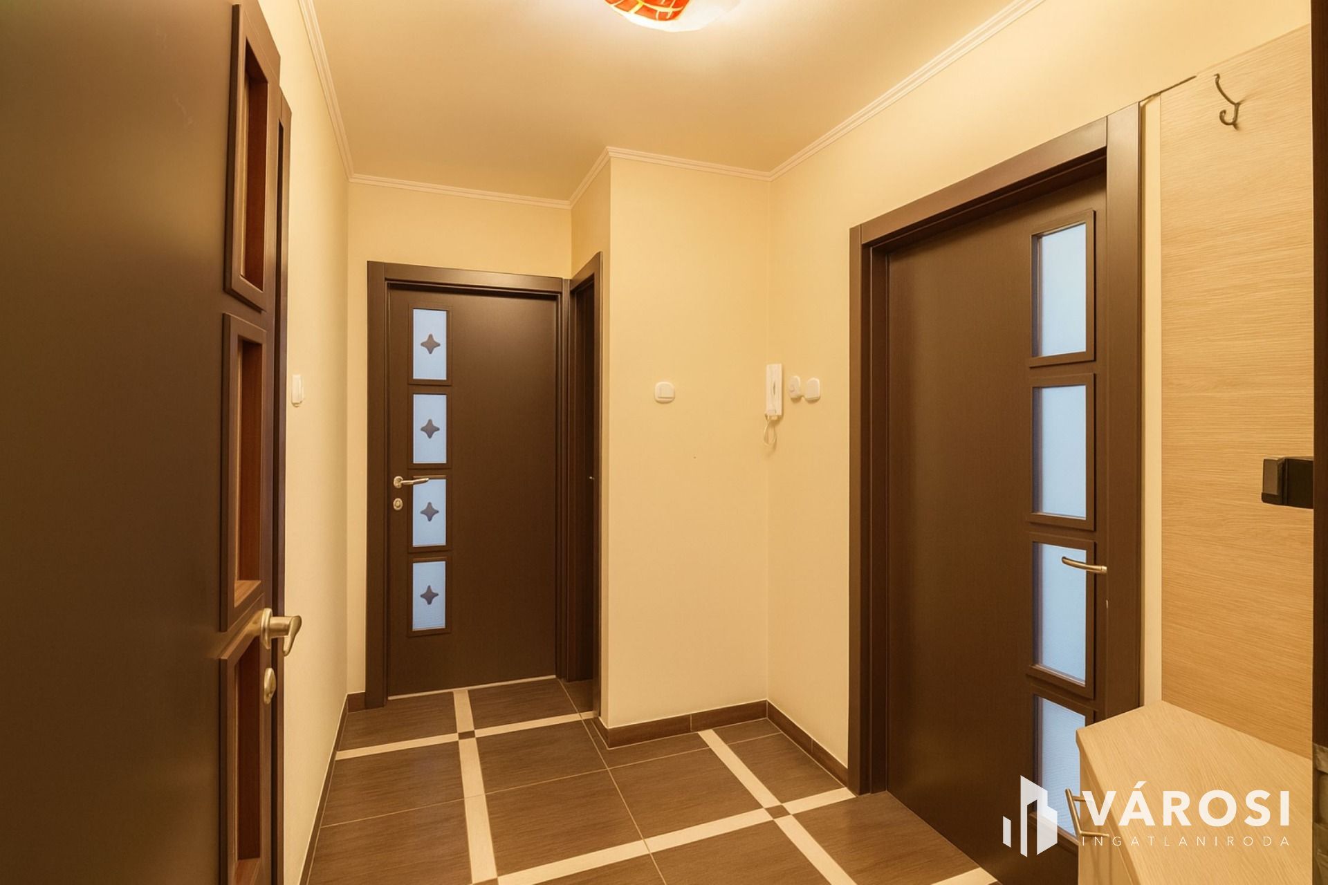 A lakás az első emeleten, a tetőtérben helyezkedik el, ahová kizárólag ehhez az ingatlanhoz tartozó, saját lépcsőházon keresztül juthatunk fel. A belső terek fiatalosak és rendkívül praktikus elrendezésűek: a közlekedőből nyílik a világos nappali és a modern konyha–étkező, amelyhez egy elegáns, kovácsoltvas korlátos erkély kapcsolódik. A két hálószoba jól szeparált, a külön WC és a mindkét irányból megközelíthető fürdőszoba pedig gondosan átgondolt, kényelmes megoldást nyújt a mindennapokban.