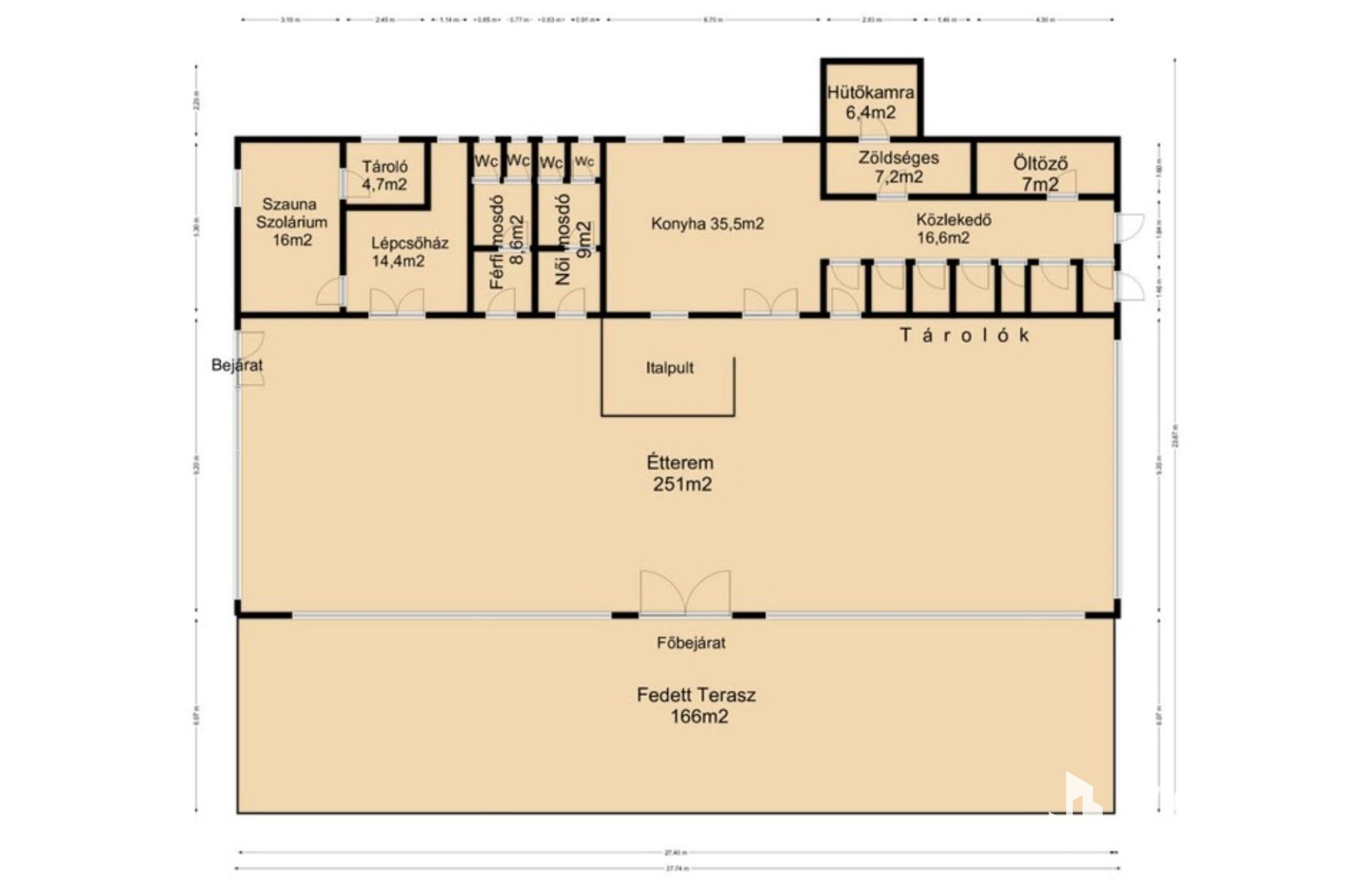 Nagykanizsától pár percre gépkocsival, közvetlen nagy forgalmú fő út szomszédságában vált eladóvá ez a lehetőségekkel teli vendéglátó egység. Funkcionálisan használható kisebb-nagyobb rendezvények lebonyolítására, (lakodalom, születésnapok, céges rendezvények..stb) valamint akár a lokációjának köszönhetően melegkonyhás étteremként és panzióként is üzemeltethető. Étterem rész befogadó képesége 180 fő, a terasz pedig további 100 fő vendég leültetésére alkalmas. A felső szinten található szobák pedig maximum 30 fő ott alvására lett kialakítva. Maga az épület beton alappal, tégla falazattal, cserép tetőfedéssel került megépítésre a 2000-es évben. Az ingatlanhoz érve léphetünk be egy közel 170m2-es fedett teraszra, ahonnan a főbejárati ajtón áthaladva érkezünk az épület központi részébe, mely 251m2-es nagyságának köszönhetően akár étterem akár rendezvényteremként is használható. Ezen légtérből megközelíthető meg a felső szint is ahol 10 külön bejáratú szoba saját vizesblokkal került kialakításra, valamint még ezen szinten háztartási helység és iroda is megtalálható. Az ingatlan teljesen klimatizált. (alsó szint, felső szint minden szoba külön-külön). Az alsó szintre visszatérve található még egy női és egy férfi illemhelység, egy nagy konyha a hozzá tartozó helységekkel és tárólokkal, hűtőházzal, személyzeti öltözővel. Az éttermi részen a dolgozok munkáját segíti, egy igényes nagy italpultrendszer is melyhez kis ablakon keresztük konyhakapcsolat is tartozik. Az ingatlan fűtése egyedi gáz cirkó, mely radiátorok és padlófűtésen keresztül szolgáltatja a meleget.